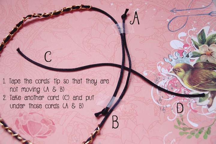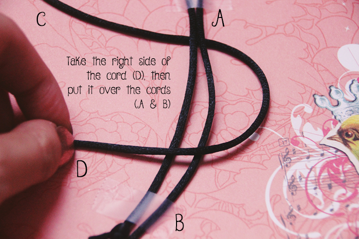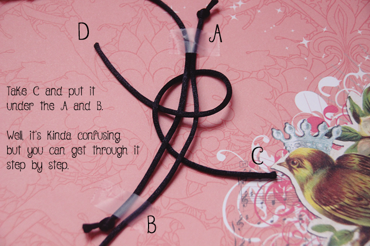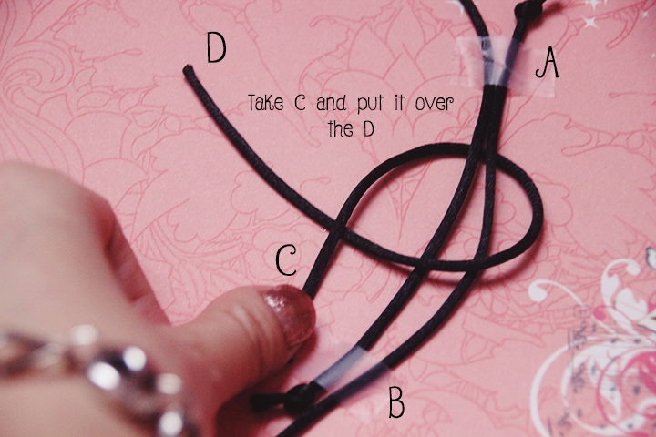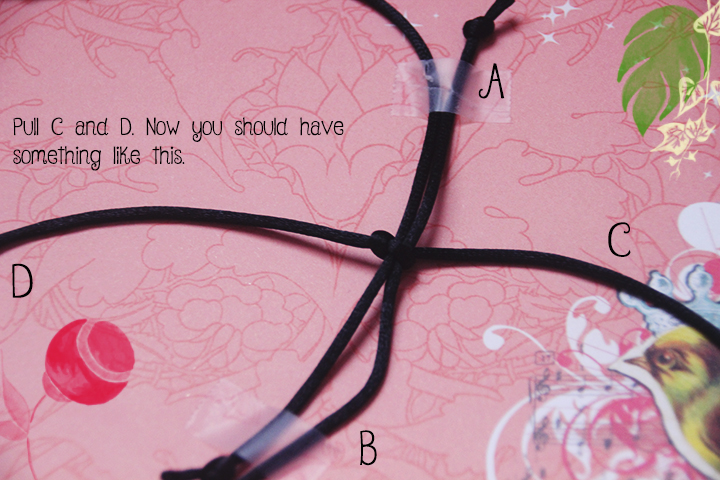 2. Ambil tali lain yang lebih pendek (kira-kira 28 cm); nama dalam gambar C&D, lalu taruh dibawah tali A dan B.