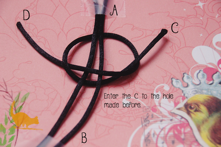 Ambil bagian kiri tali yang tadi (C) lalu taruh di atas D.